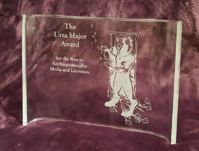 The Ursa Major Awards are Anthropomorphic (a.k.a. Furry) Fandom's equivalents of s-f fandom's Hugo Awards, mystery fandom's Anthony Awards, horror fandom's Bram Stoker Awards, and so forth. The Ursa Majors are administered and presented by the Anthropomorphic Literature and Arts Association (ALAA), an organization dedicated to promoting anthropomorphic literature and arts both within and outside of the fandom. Nominations and voting for the awards are open to the public. The physical award consists of a acrylic plaque with art designed by Heather Bruton as per the sample at right.